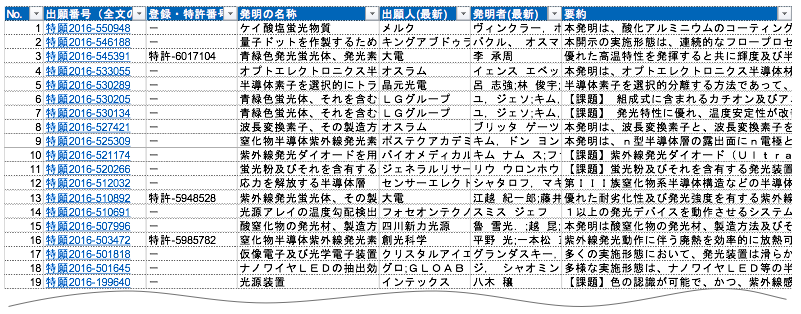 エクセル形式ですので、フィルタ機能を使えば、興味のある出願人に絞って効率よく要約を読むこともできます。